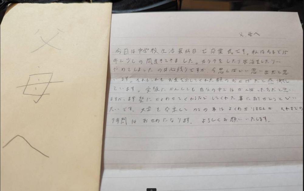 今年大学受験を控えている息子が中学を卒業する時に書いたものが最近みつかりまして・・・。